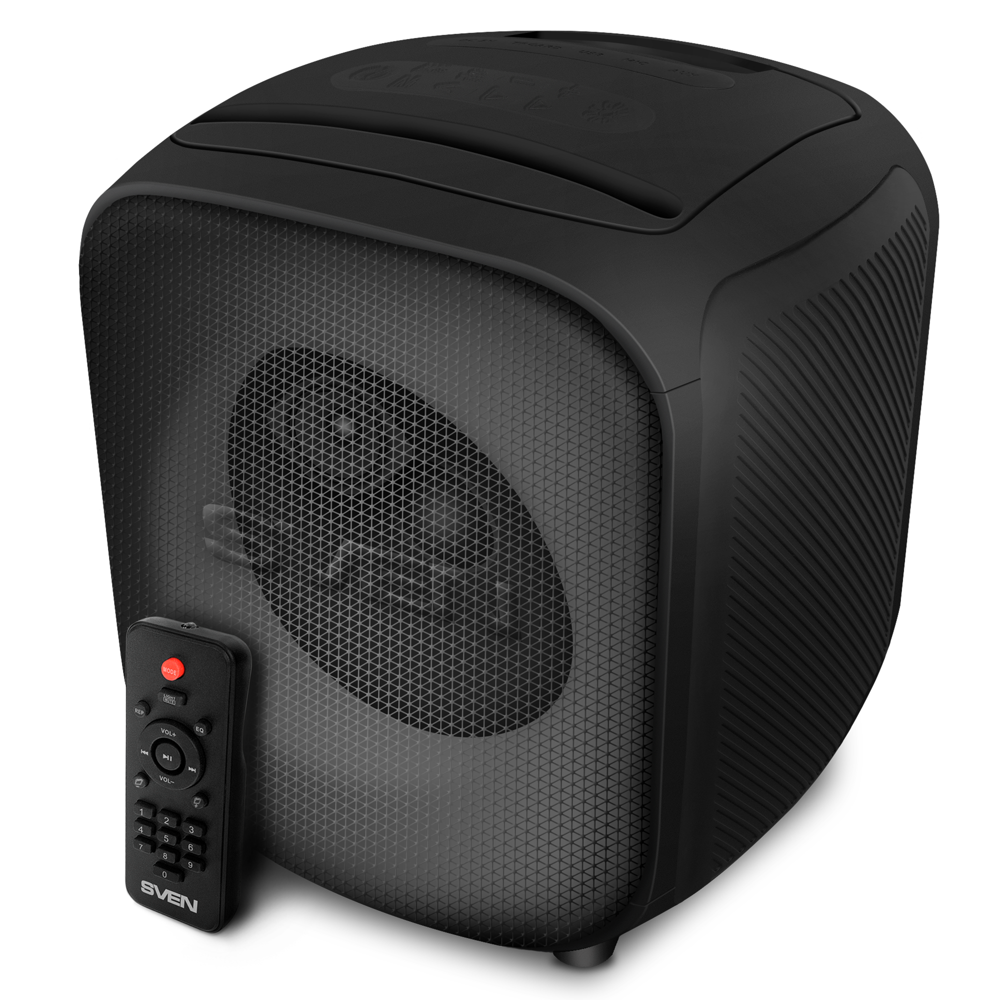 And all this fits into a speaker weighing only 3.7 kg and measuring 362×302×254 mm. SVEN PS-555 is really easy to take with you to any party. There is a sturdy ergonomically shaped handle for easy carrying. It is easier and more convenient to connect the sound source via Bluetooth — without wires and unnecessary difficulties. The smartphone can be placed in a special holder on the top panel, where it will be securely fixed in a convenient position, allowing you to read the titles of the songs or the lyrics of the songs being performed from the screen.