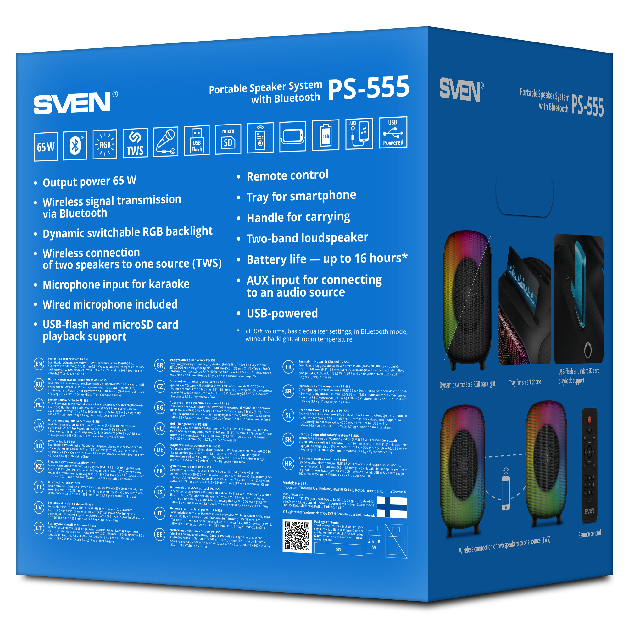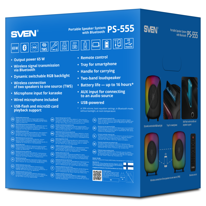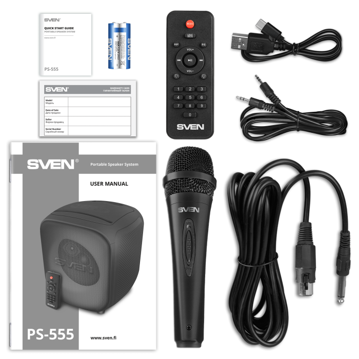 We present a portable acoustics for those who cannot imagine their life without music, parties and karaoke singing. SVEN PS-555 developers have managed to put everything you need into a compact portable audio system to turn any meeting of friends into a vivid event that all its participants will remember for a long time. First of all, the developers of the audio system took care of loud and high-quality sound assuredly.