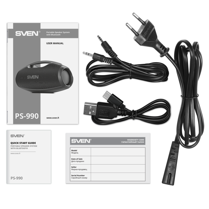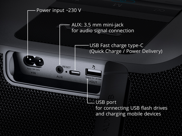 The design of PS-990 is laconic and modern. The smooth shapes make the case visually light: the speaker does not look bulky, but at the same time retains its impressiveness. The 11.1 V, 5200 mAh (57.72 Wh) battery provides up to 16 hours of battery life. It can be charged in two ways: from a 220 V mains using a bundled cable or via USB Type-C with support for Quick Charge and Power Delivery, depending on the situation. SVEN PS-990 boombox speaker is equally suitable for an outdoor area, for an apartment and for a country house, providing powerful sound and a festive atmosphere.