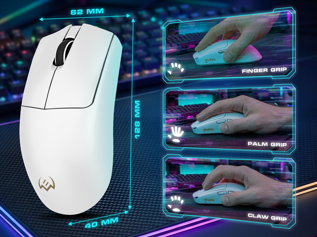 Tired of looking for a mouse that fits your grip? Our model with a symmetrical design and unique dimensions solves this problem: it’s equally comfortable for claw, palm, and finger grips. It also fits hands of any size.