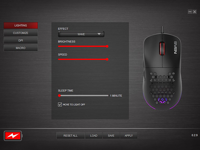 However, design is just the beginning. One of the most advanced sensors on the market, Pixart 3395, is installed inside SVEN RX-G980W. It allows you to adjust the resolution in an extremely wide range — from 50 to 26,000 DPI, providing exceptional accuracy and sensitivity in any gaming situation. The local storage helps to save all settings of the mouse directly in the device and they are available even when changing the PC, allowing gamers to instantly adapt to different conditions - in particular, to feel at home in gaming clubs and during eSports competitions.