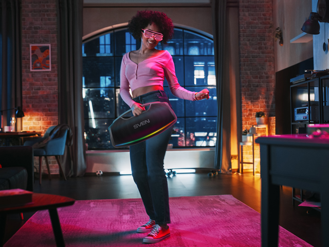 The design of PS-990 is laconic and modern. The smooth shapes make the case visually light: the speaker does not look bulky, but at the same time retains its impressiveness. The 11.1 V, 5200 mAh (57.72 Wh) battery provides up to 16 hours of battery life. It can be charged in two ways: from a 220 V mains using a bundled cable or via USB Type-C with support for Quick Charge and Power Delivery, depending on the situation. SVEN PS-990 boombox speaker is equally suitable for an outdoor area, for an apartment and for a country house, providing powerful sound and a festive atmosphere.