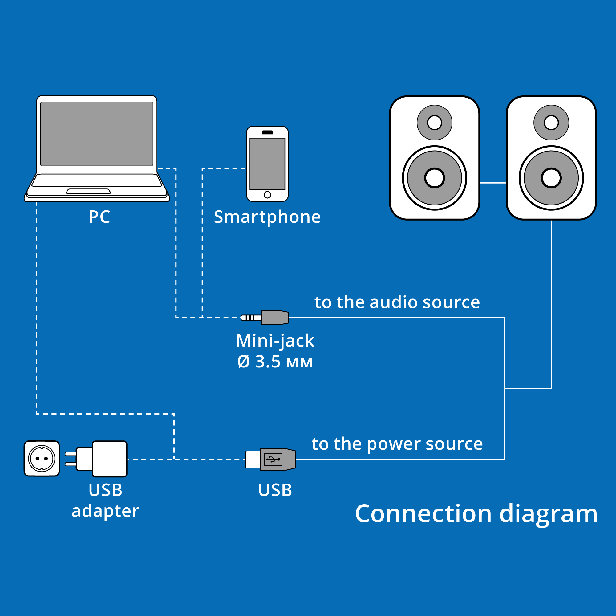 The acoustic system (AS) SVEN 470 is fitted with amplifiers of high output power, and connection of AS to USB ports of some devices can cause appearing of noise. This is caused by lack of power of a particular port in a particular device. For high quality operation of AS we recommend to use external power adapter with the following properties: 5V/2.4-3A.