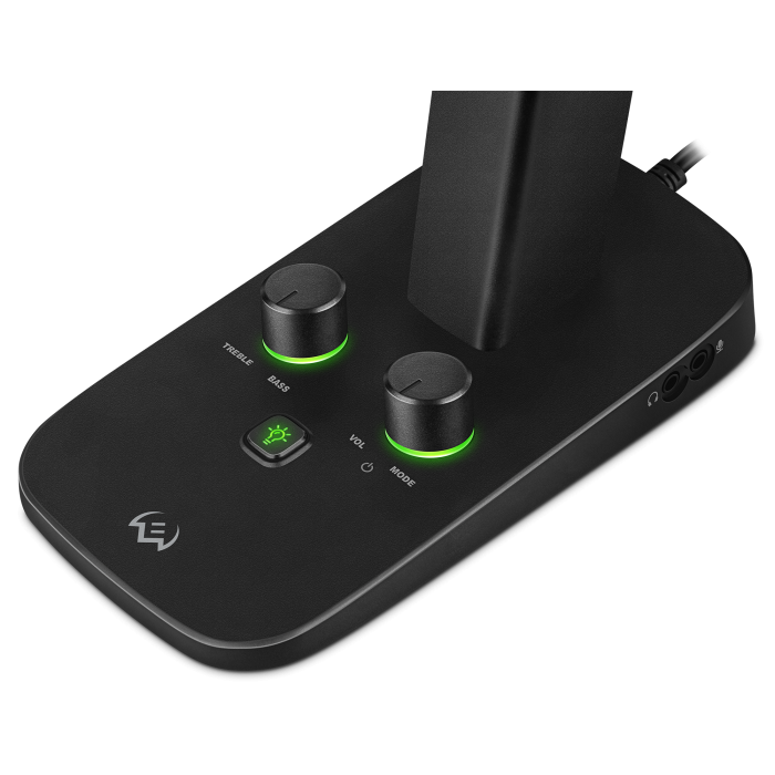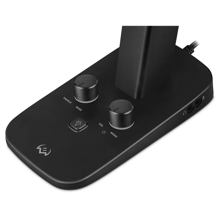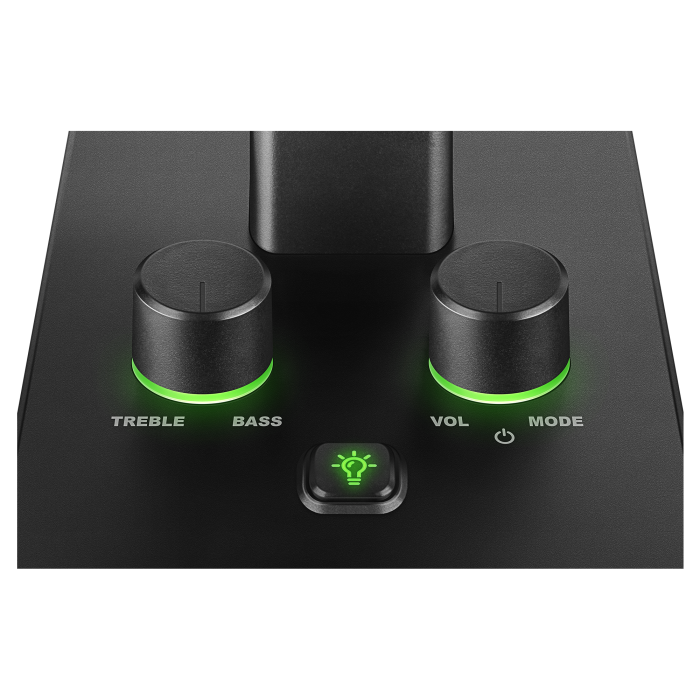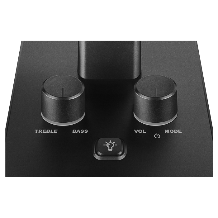 The SVEN G600 satellites feature a distinctive gamer-inspired design crafted from durable matte-finish plastic with clean lines and a refined texture. On the front panel, intuitive multifunctional knobs let you not only switch between playback modes but also fine-tune your sound — adjusting volume, treble, and bass to suit your personal taste. A dynamic RGB lighting system adds a vibrant visual flair, smoothly pulsing to the rhythm of your music or statically illuminating your space in your chosen color. If preferred, the lighting can be fully disabled for a pure, distraction-free audio experience.