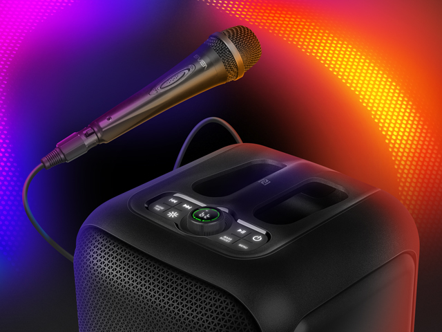 Раскройте свои таланты исполнителя, подключив к колонке микрофон, входящий в комплект. Настройте желаемую громкость звучания голоса на панели управления. Порадуйте близких живым звучанием любимых мелодий!