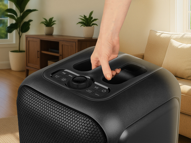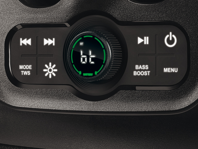 Управлять параметрами PS-880 можно как с помощью регуляторов на верхней панели корпуса, так и с пульта дистанционного управления, который входит в комплект. Параметры работы отображаются на компактном, но информативном LED-дисплее, который эффектно встроен в ручку регулировки громкости и служит еще одним заметным и интересным декоративным элементом, придающим оригинальности дизайну. Среди полезных особенностей стоит отметить и быструю зарядку через USB Type-C с поддержкой Quick Charge и Power Delivery, которая заметно сокращает время подготовки колонки к следующей вечеринке.