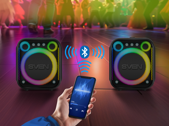 SVEN PS-880 подойдёт и для любителей караоке: в комплекте есть проводной микрофон, а два микрофонных входа позволяют петь дуэтом. Регулируемый эффект эха добавляет голосу глубины и объёма. Подключение к источнику звука возможно по Bluetooth, а для быстрого сопряжения предусмотрена NFC-метка. Также доступно проводное подключение через AUX и воспроизведение аудиофайлов напрямую с USB-накопителя или карты microSD.